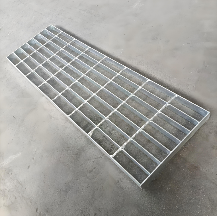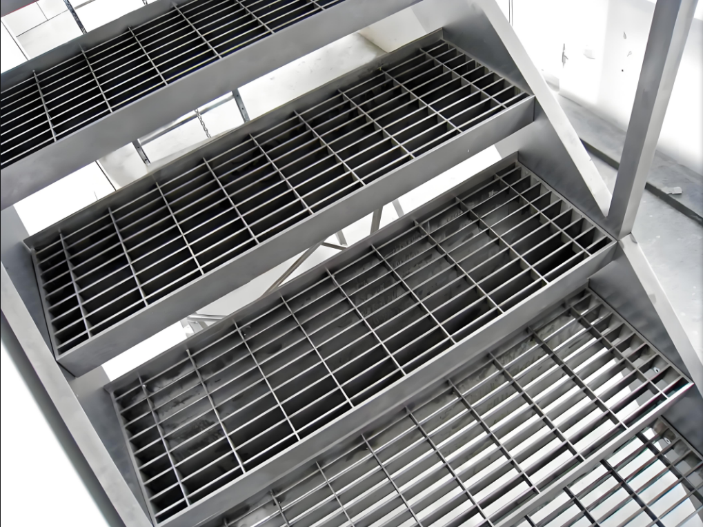 Stepped steel grating (also known as platform step plates) features a grid structure formed by cross-welding flat bars and crossbars. It is primarily used in industrial, municipal, and commercial settings for staircases, walkways, and similar applications.